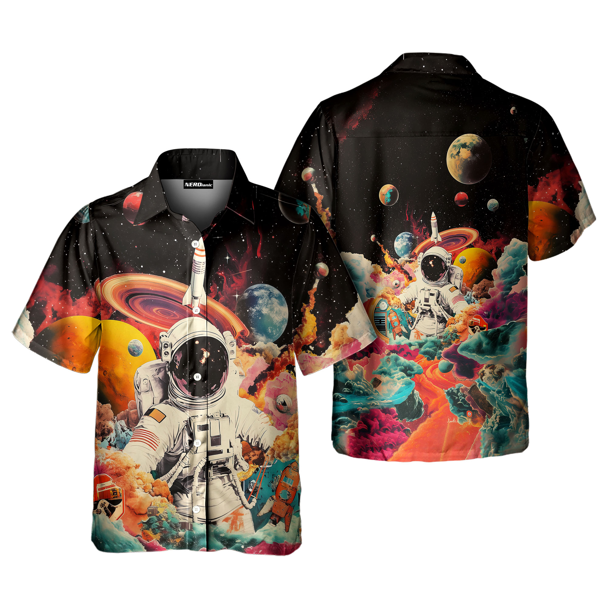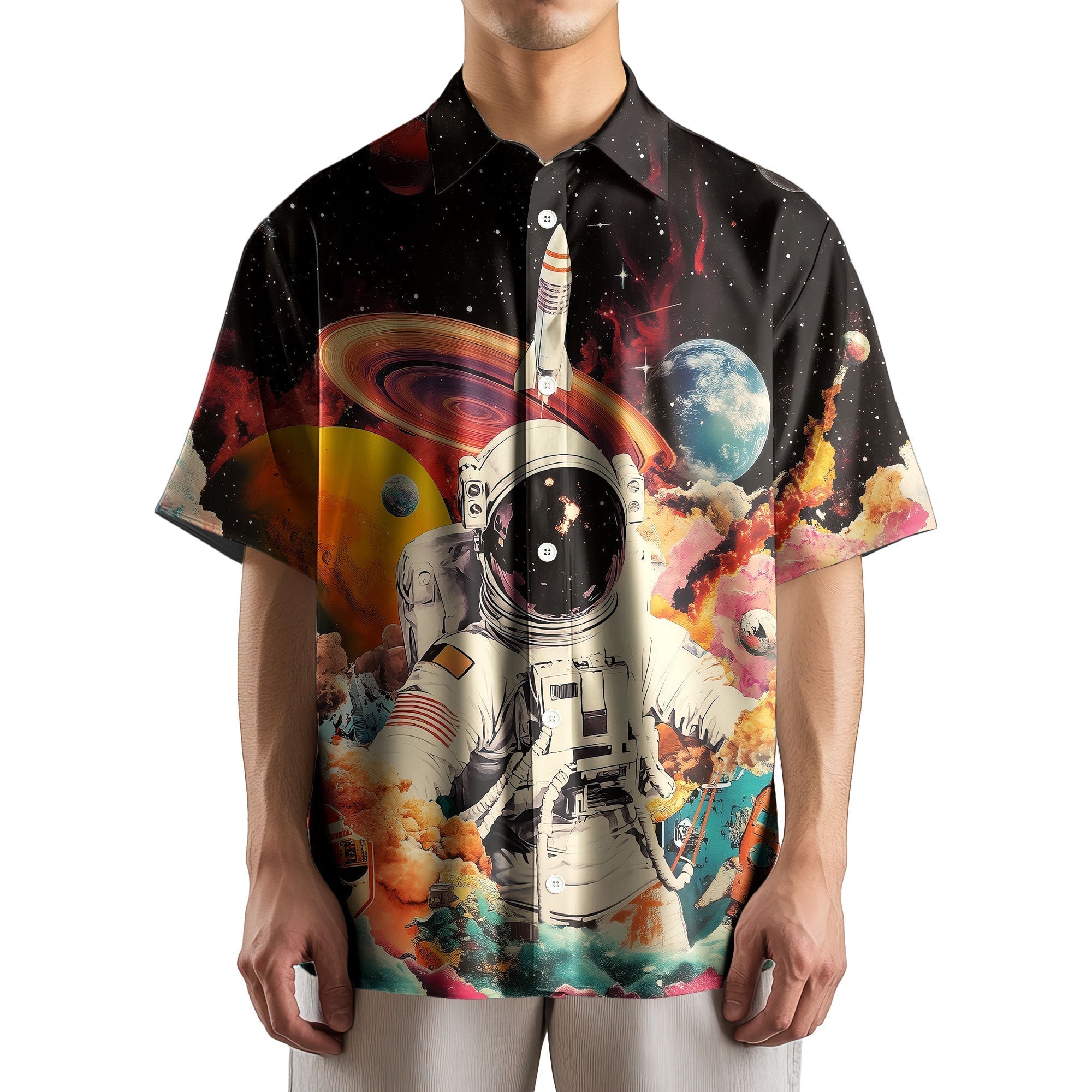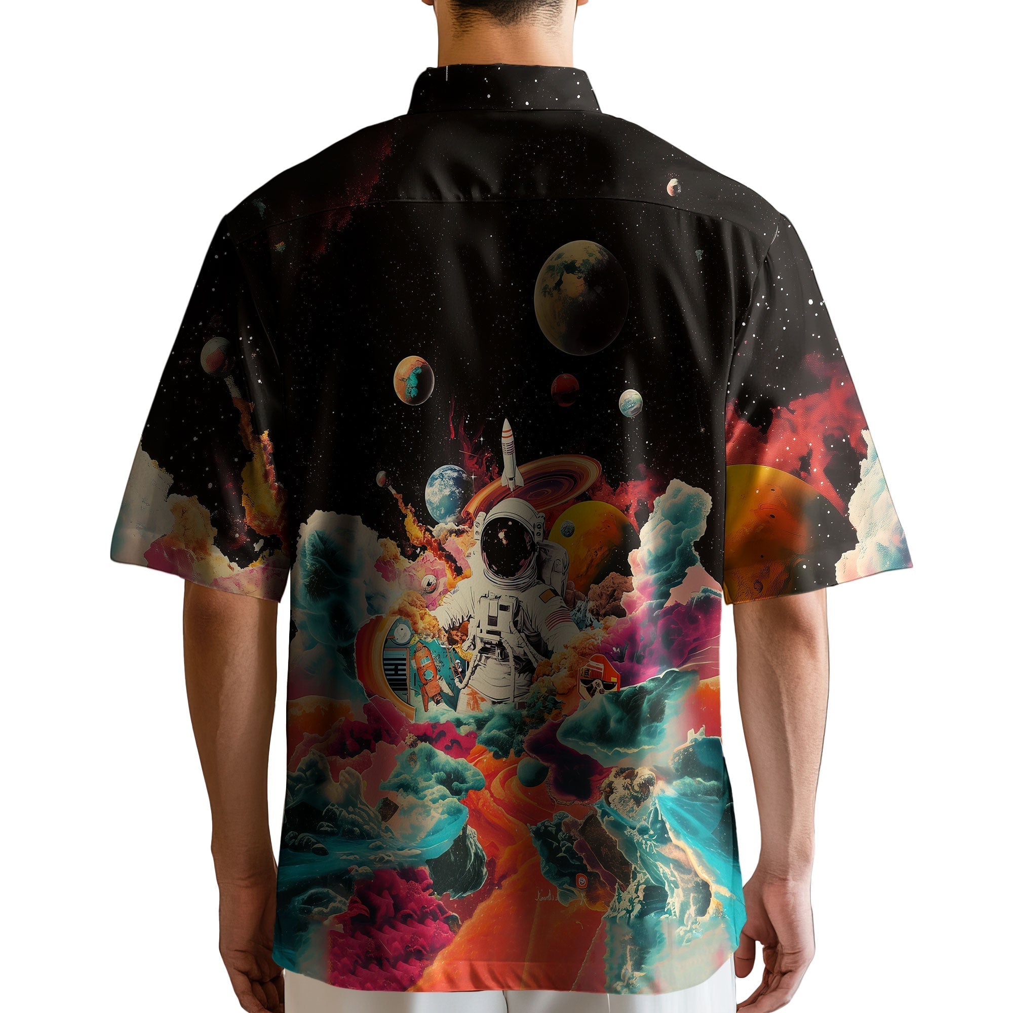 GIFTS FOR NERDY GUYS: This short-sleeved button shirt features a stunning cosmic, showcasing an astronaut floating amidst a vivid, surreal space scene. The space shirt includes colorful planets, swirling nebulae, and dynamic celestial elements, creating a mesmerizing galaxy-inspired visual narrative