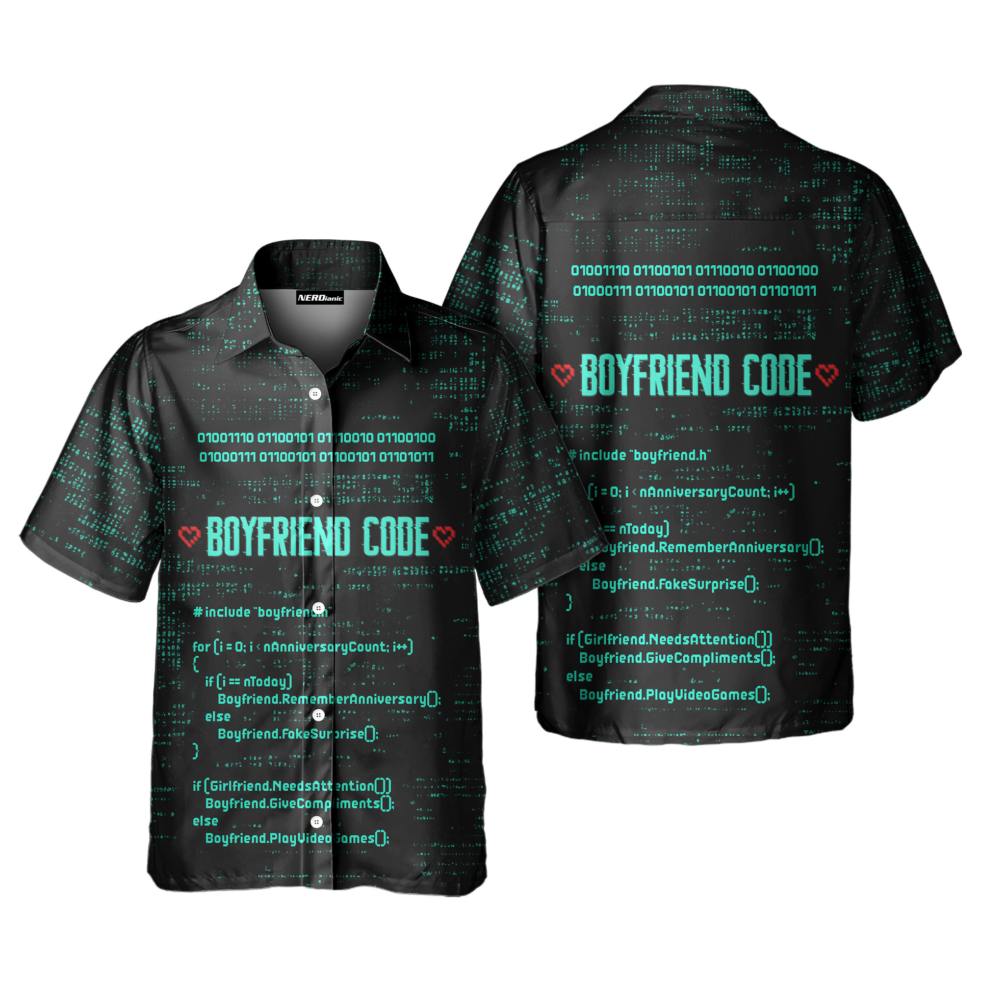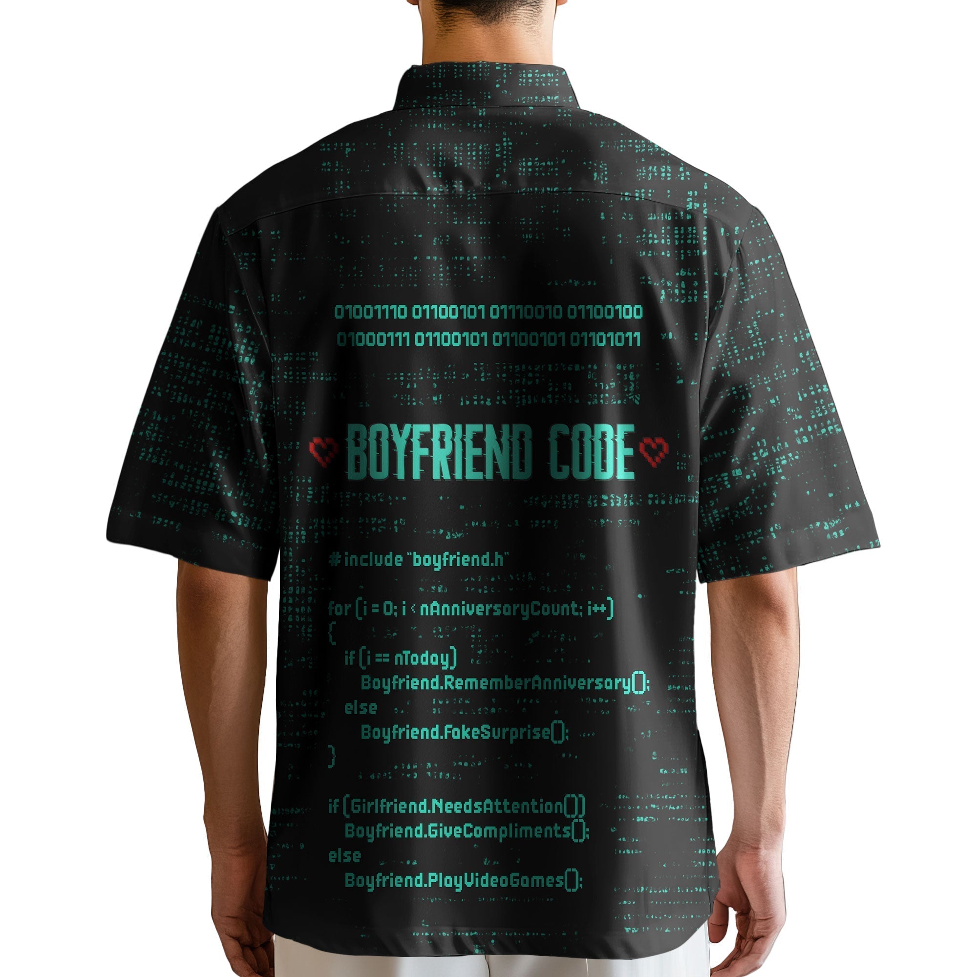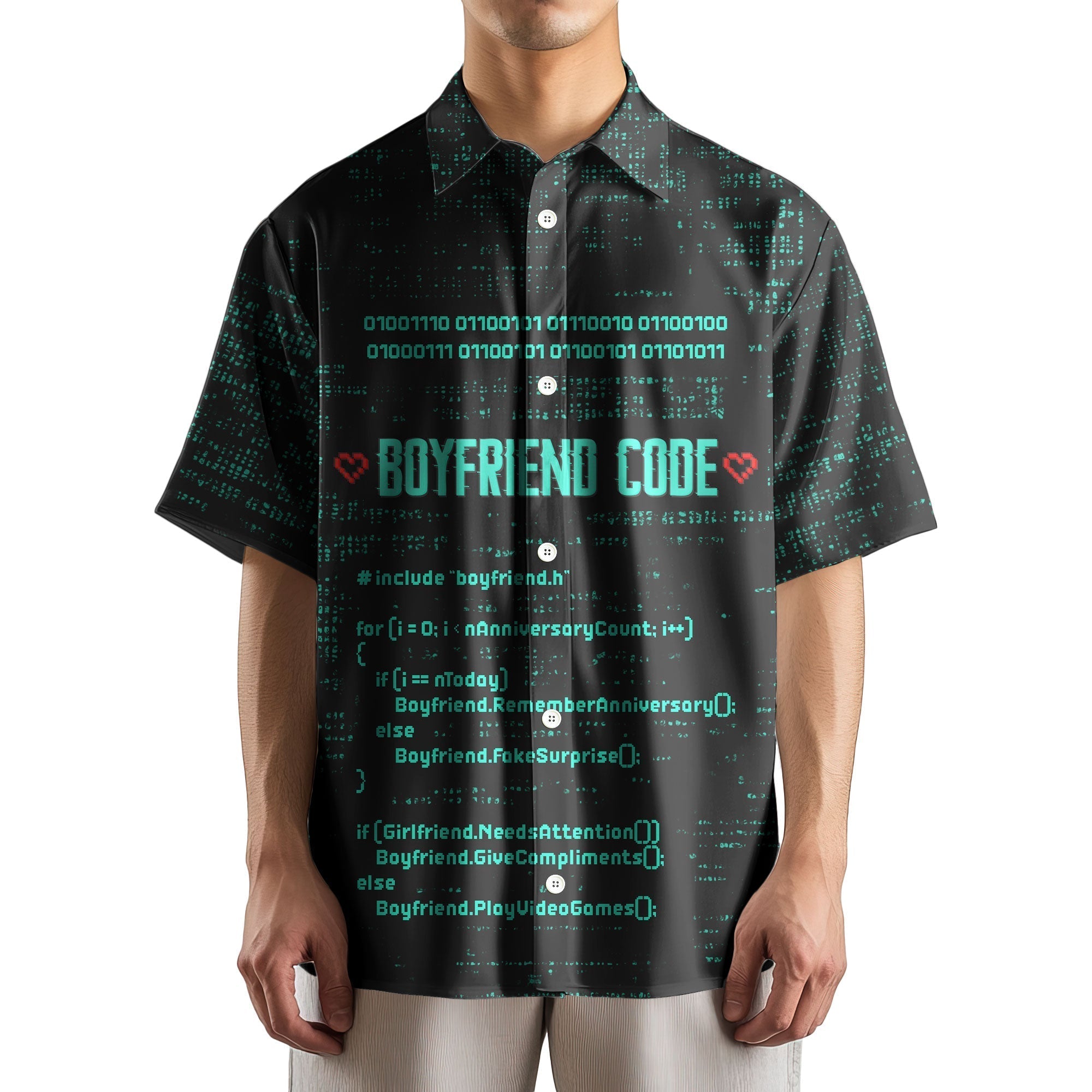 FUNNY NERD GIFT FOR BOYFRIEND: This button shirt use binary code and C/C++ programming language that ideal gift for your boyfriend. The first section checks if today matches an anniversary; if it does, the boyfriend "remembers" the anniversary, and if not, he "pretends to be surprised." The second section uses a conditional statement to check if the girlfriend needs attention; if she does, the boyfriend gives compliments, and if not, he resumes playing video games