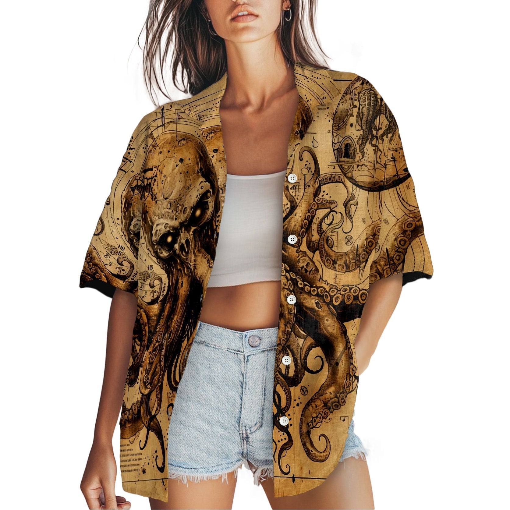 Nerdianic will show your nerd pride with this Brown Giant Octopus Geek Hawaiian Shirt - a modern Hawaiian shirt designed for fans of dragon shirts, octopus shirts, and fantasy shirts alike. With bold fantasy graphics and a comfy fit, this standout piece brings a playful twist to classic Hawaiian style for every adventure seeker.
