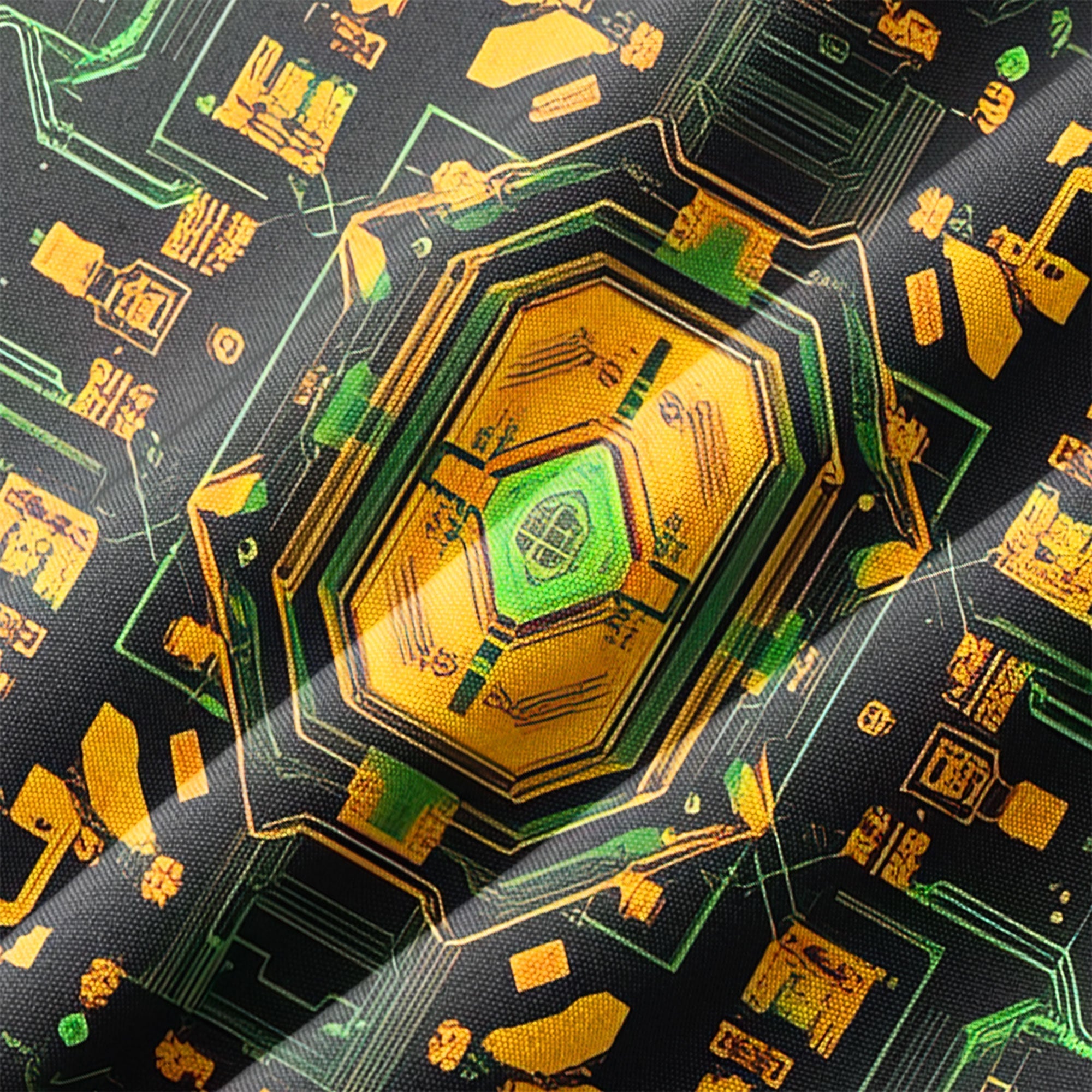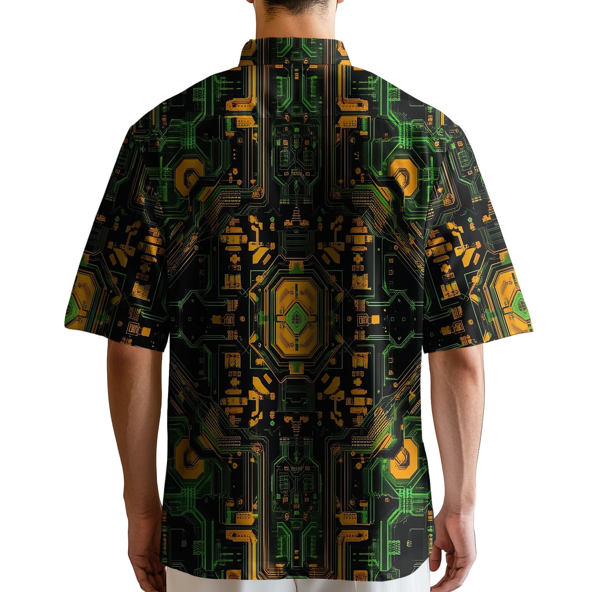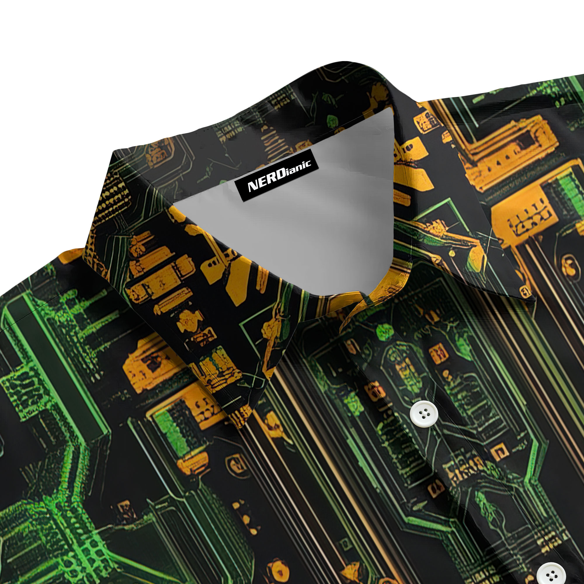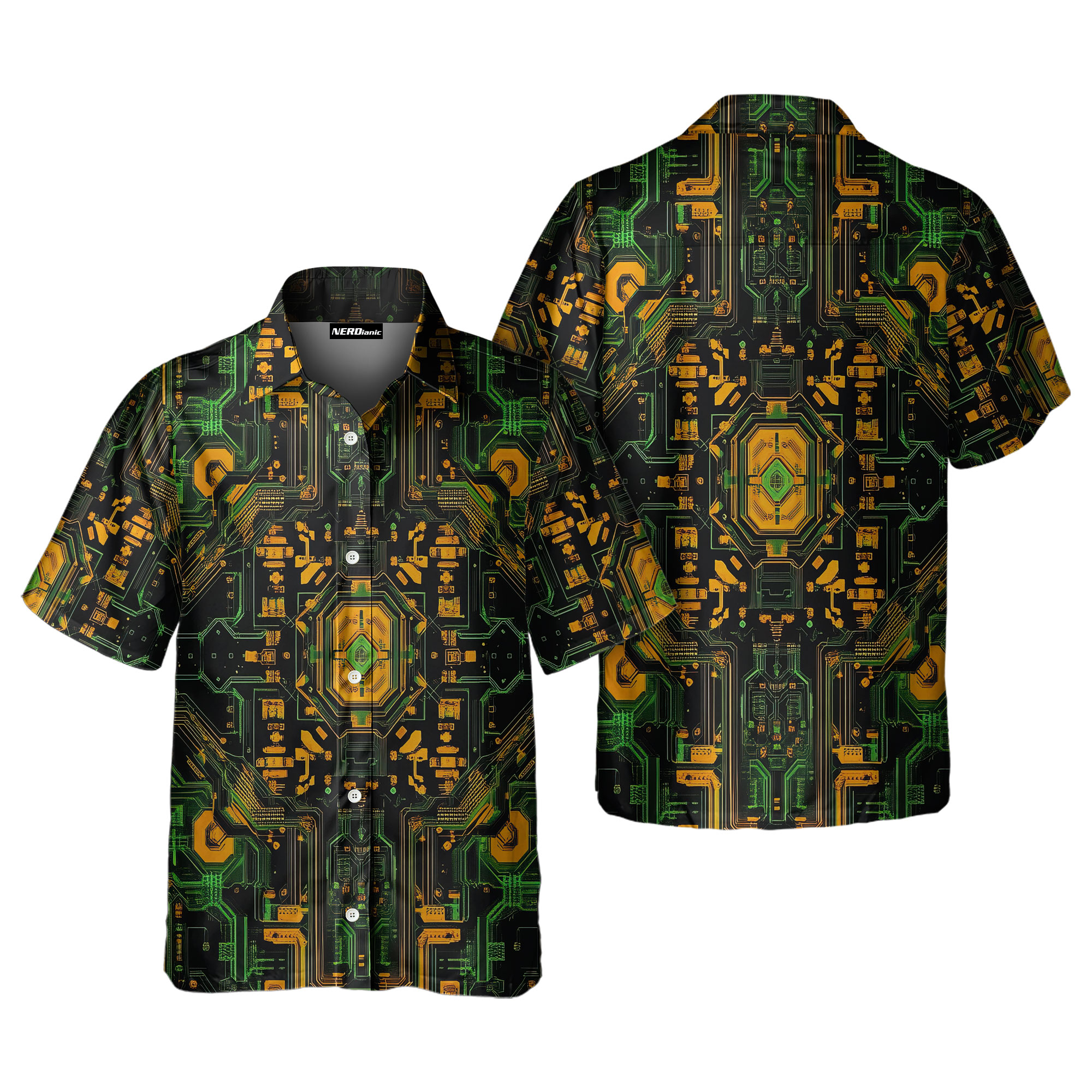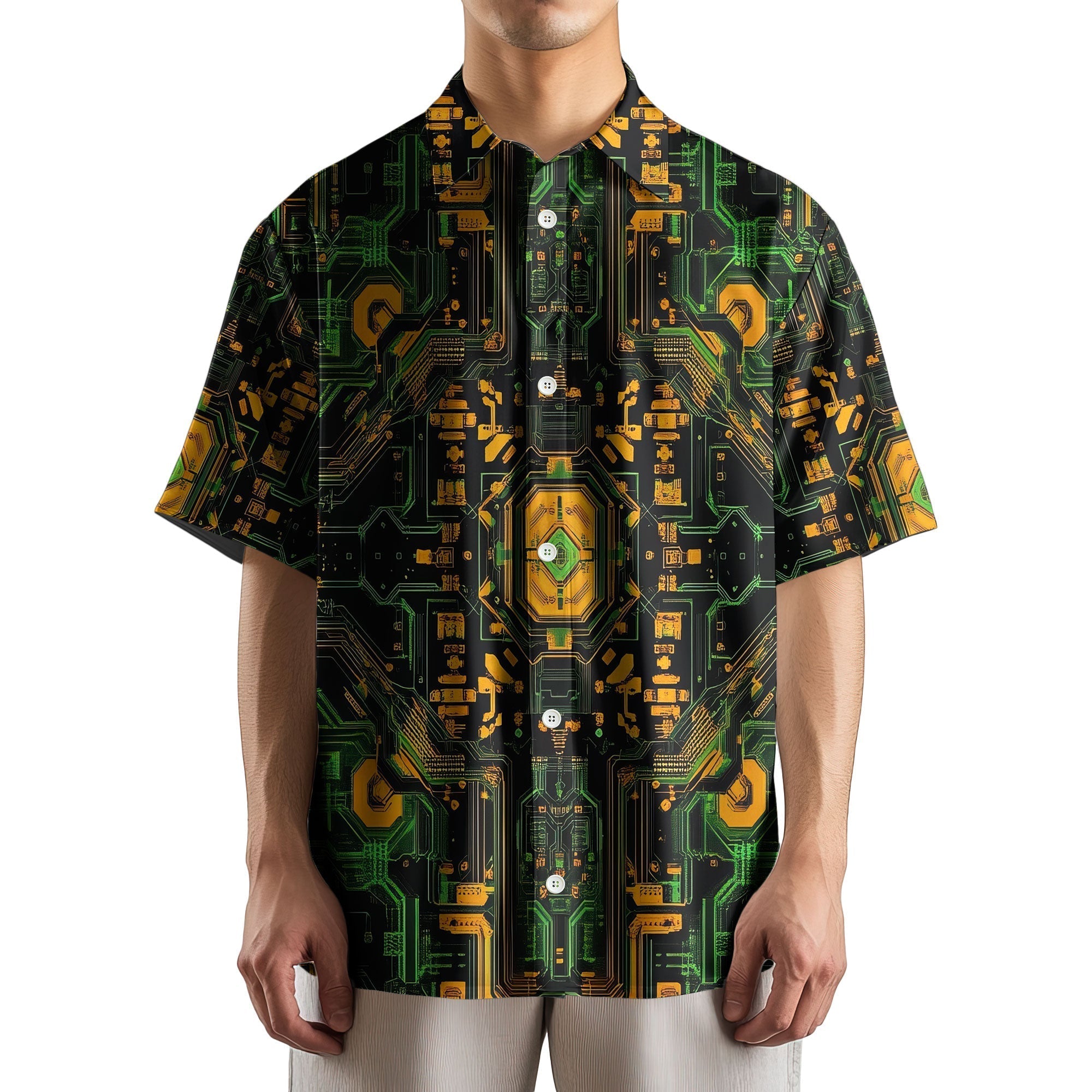 GIFTS FOR NERDY GUYS: This science button-down shirt features a bold digital circuit board-inspired design in vivid shades of green and orange on a black background. The intricate arrangement of technological elements creates a visually captivating pattern, perfect for tech enthusiasts or those who love innovative, futuristic fashion