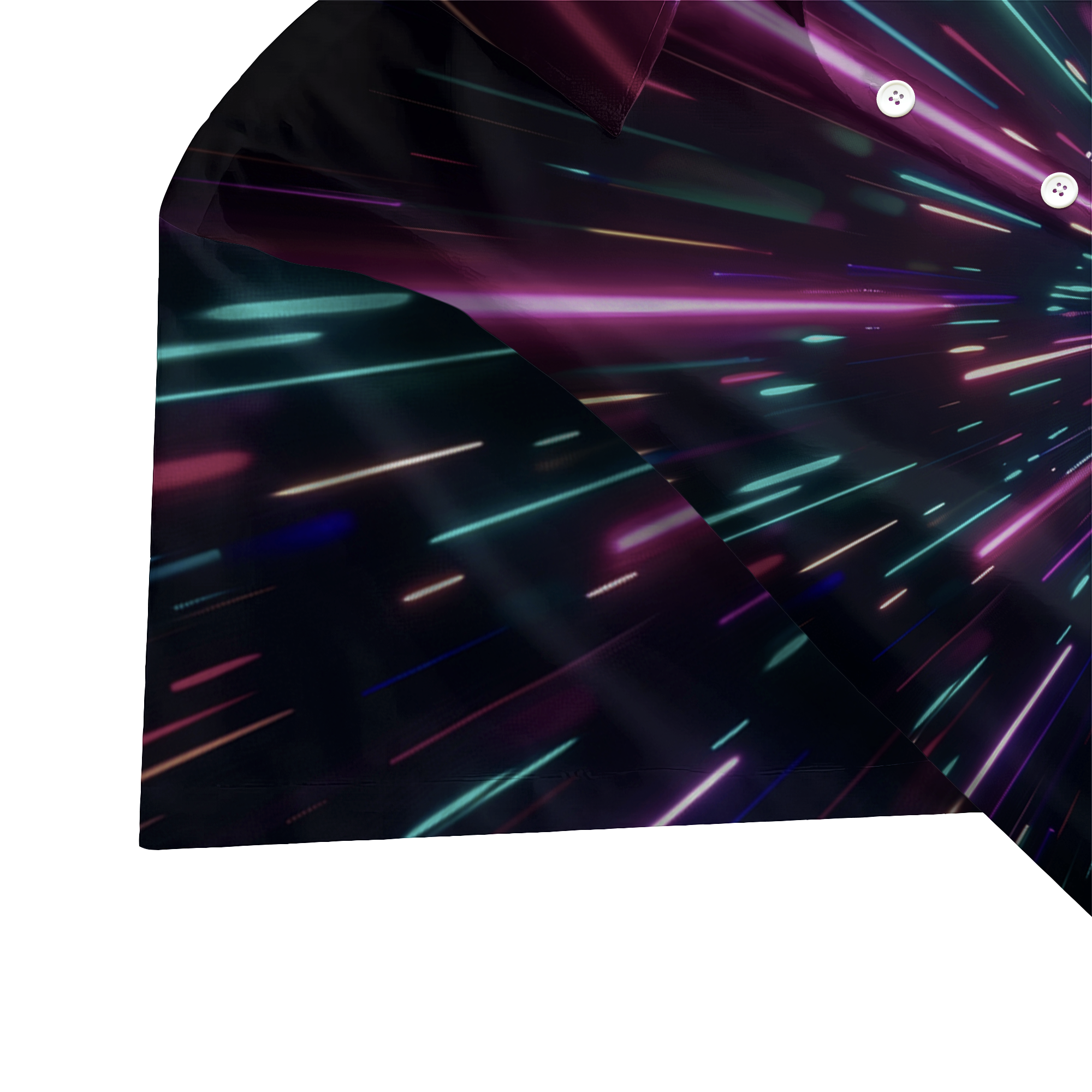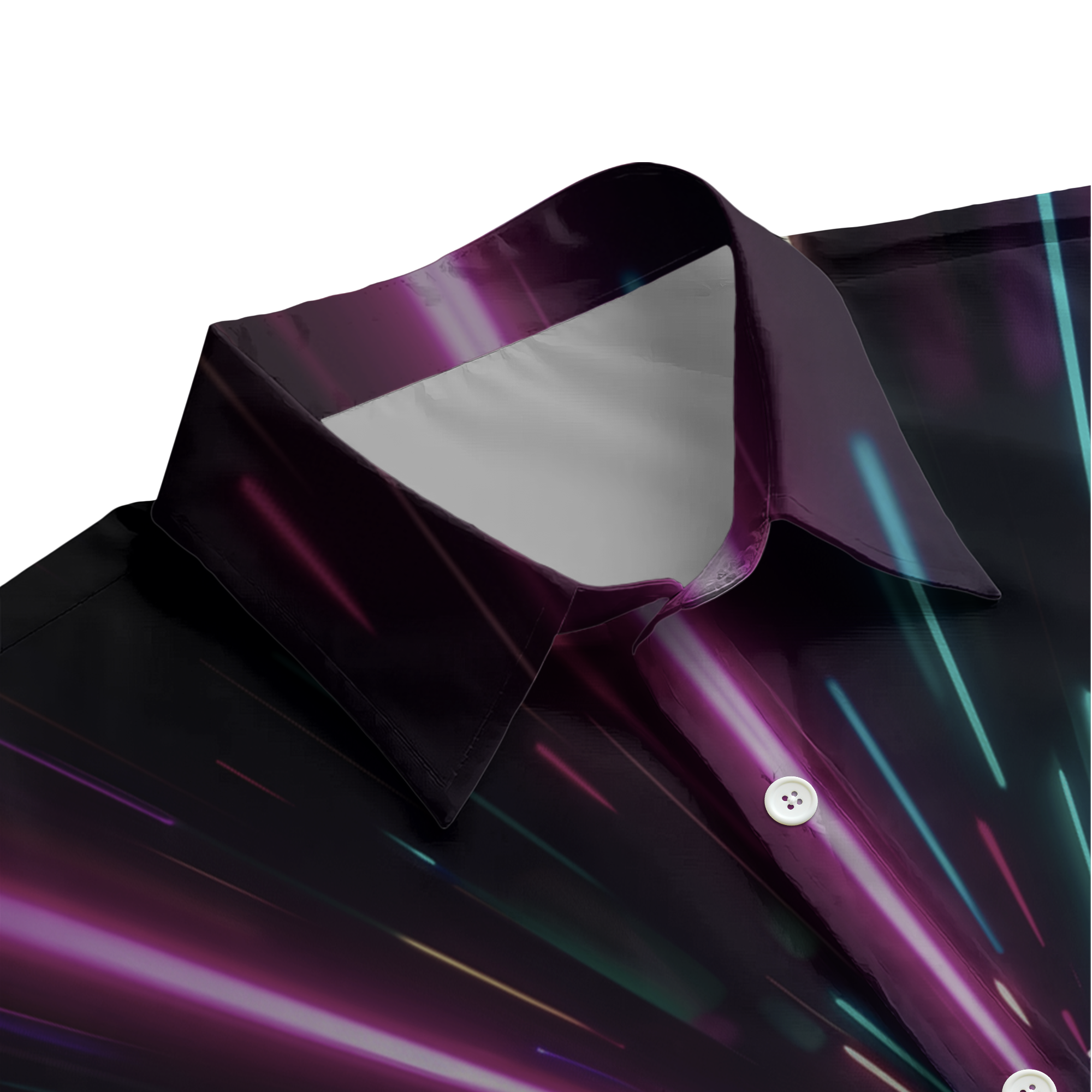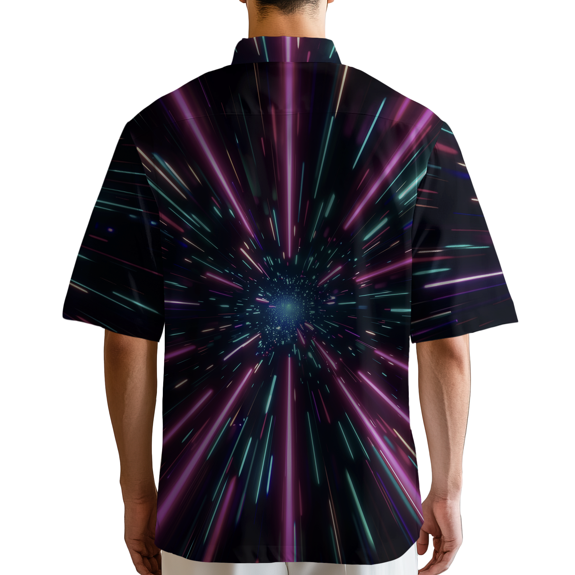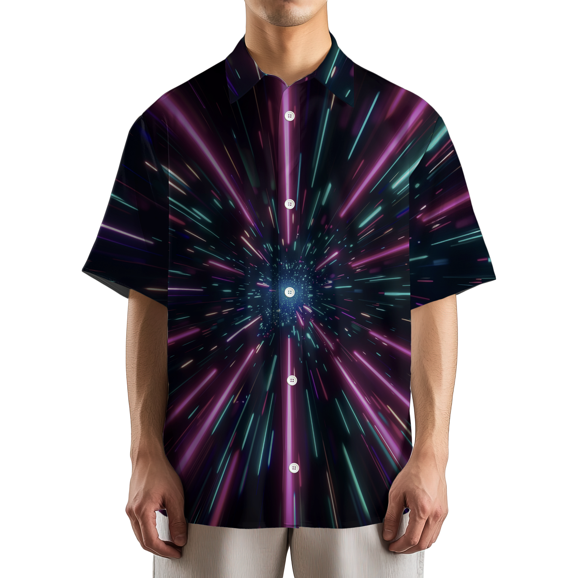 SPACE BUTTON SHIRT: This short-sleeve button-down shirt features a mesmerizing digital galaxy print, capturing the breathtaking beauty of deep space. The vividly detailed spiral galaxy, blending cosmic purples, blues, and blacks to create a visually stunning effect. Perfect for astronomy lovers, science enthusiasts, and stargazers