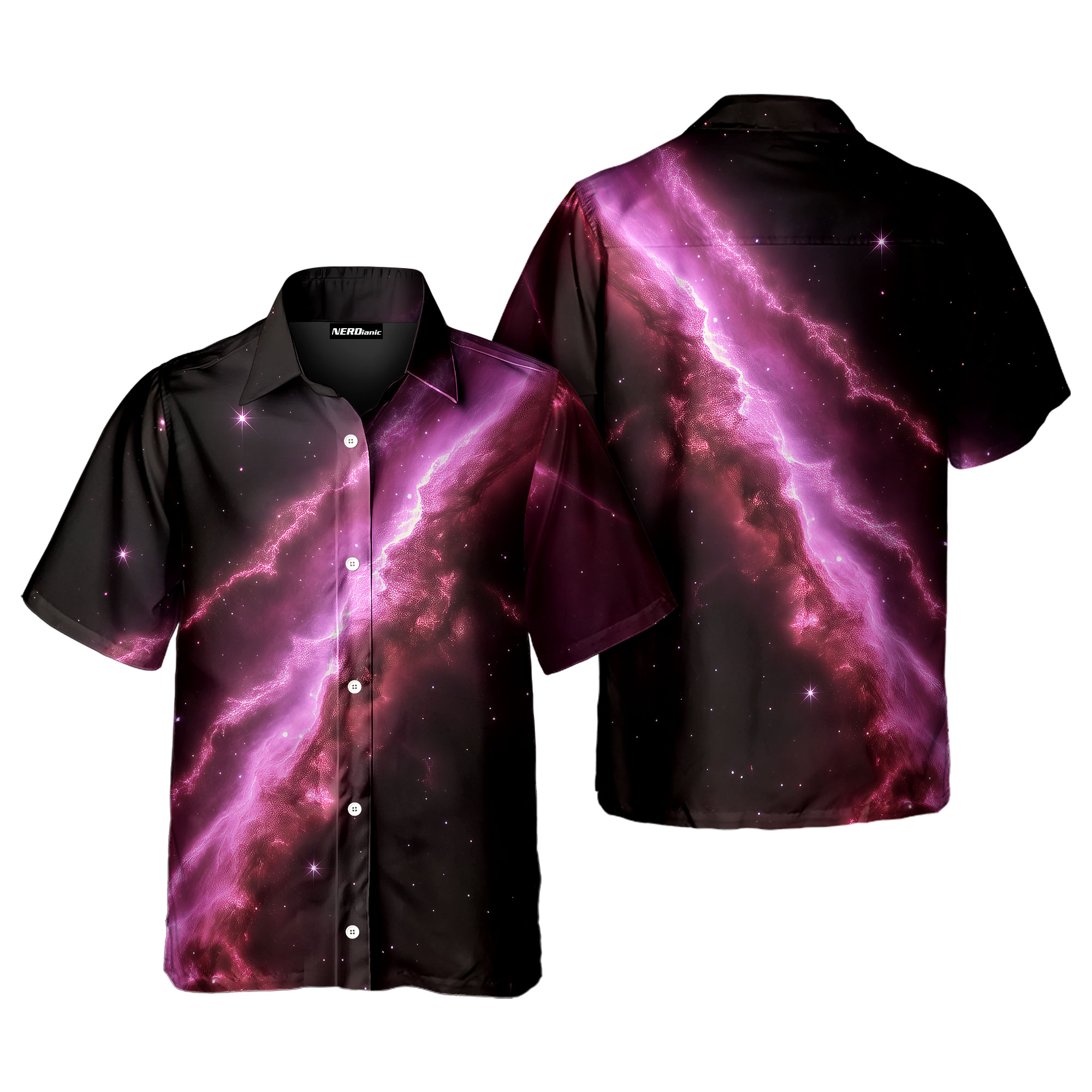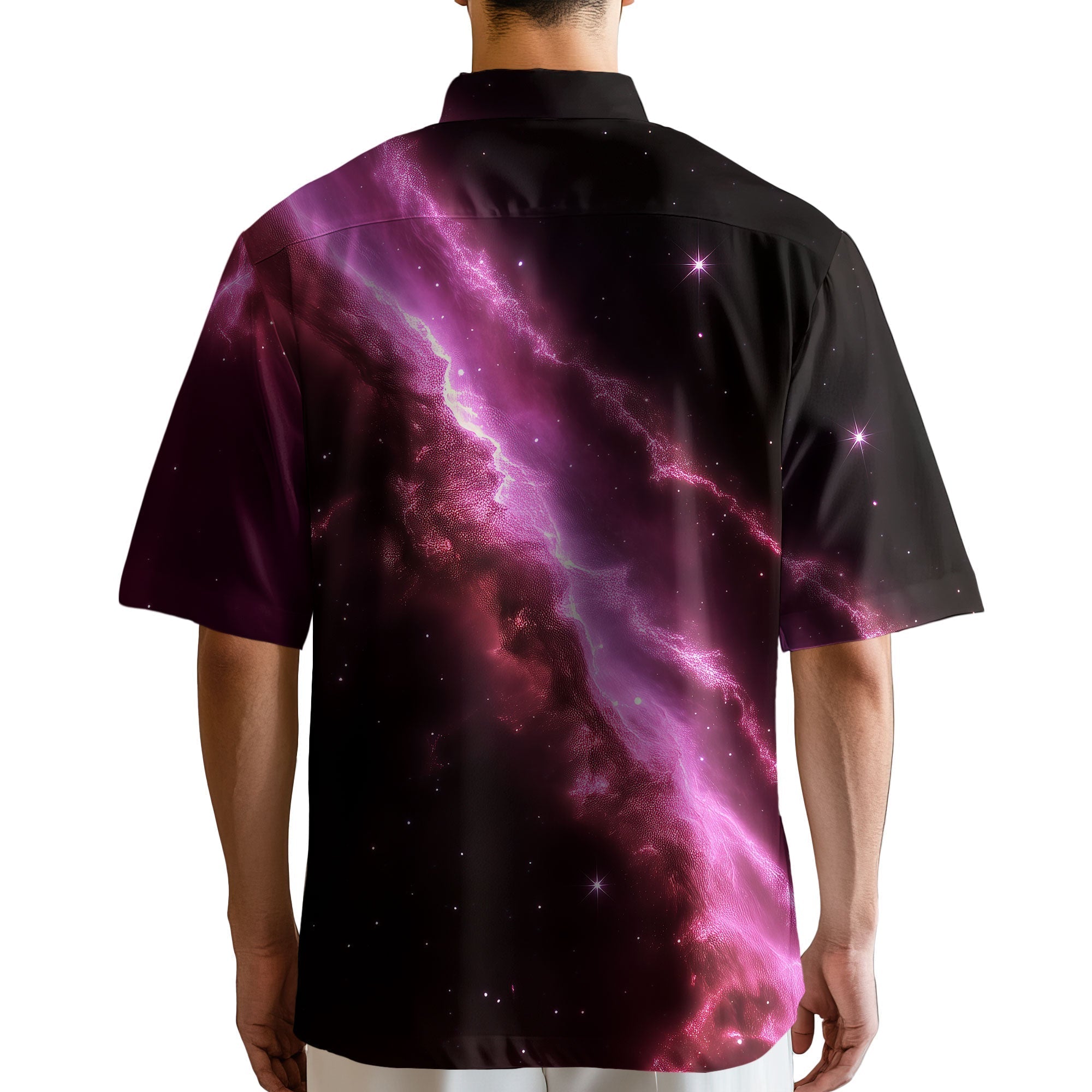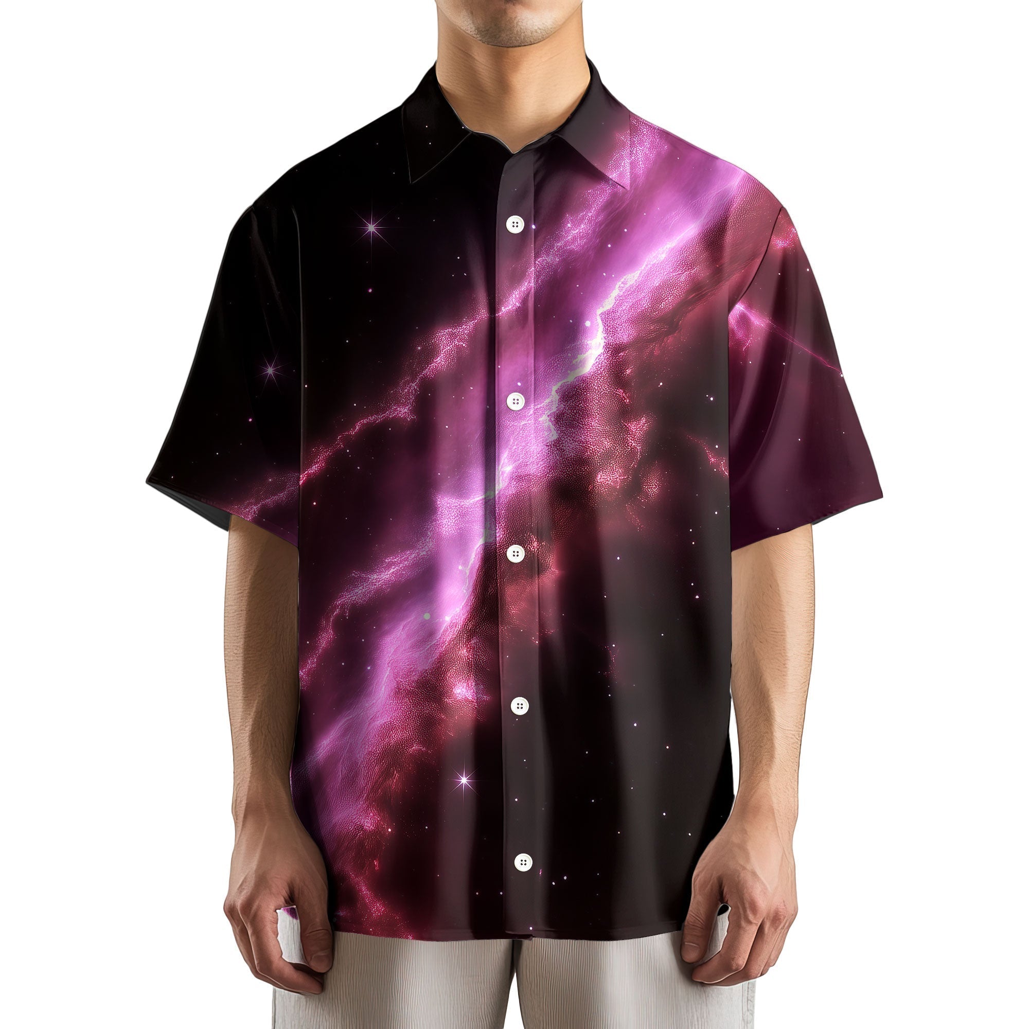 SPACE BUTTON SHIRT: This short-sleeve button-down shirt features a mesmerizing digital galaxy print, capturing the breathtaking beauty of deep space. The vividly detailed spiral galaxy, blending cosmic purples, blues, and blacks to create a visually stunning effect. Perfect for astronomy lovers, science enthusiasts, and stargazers