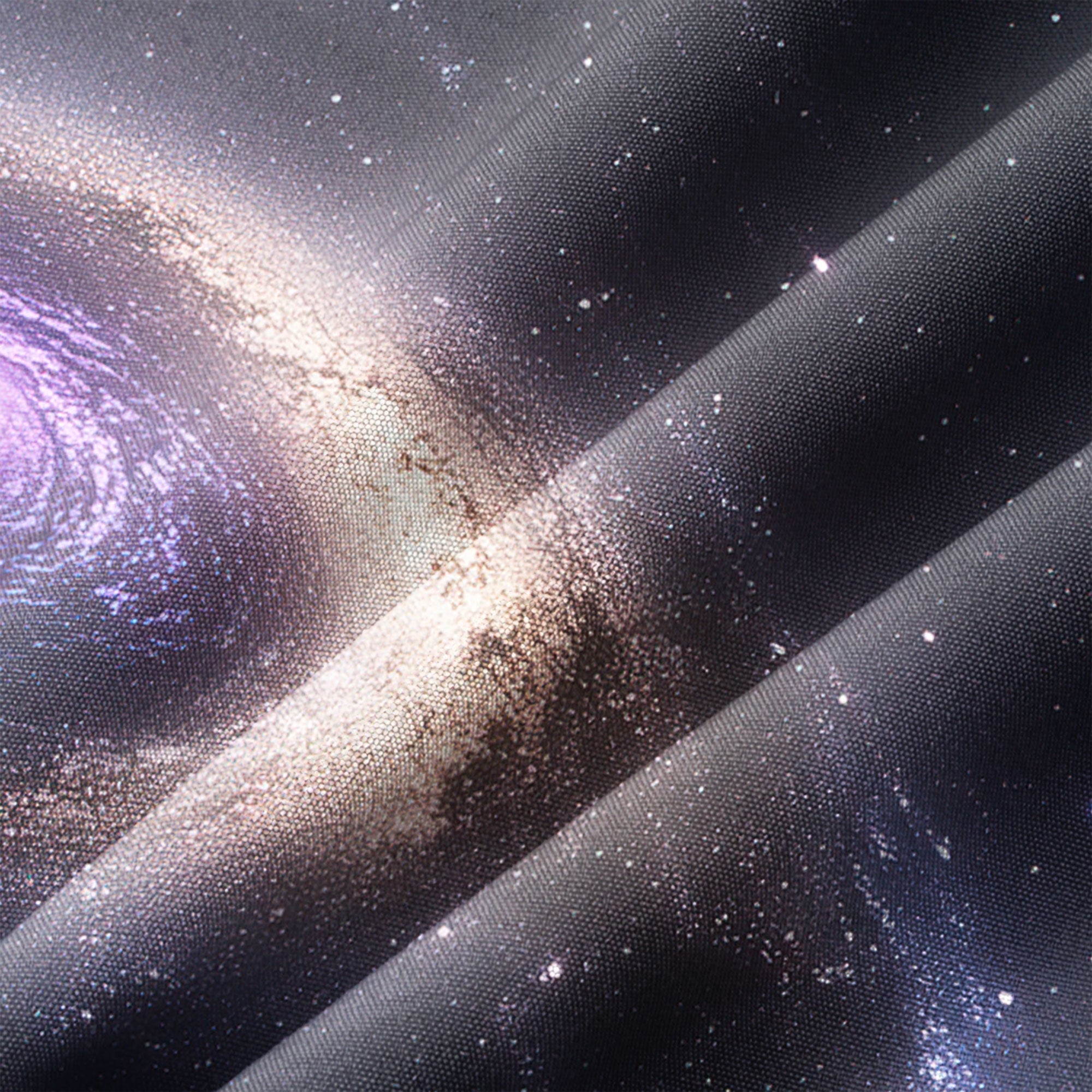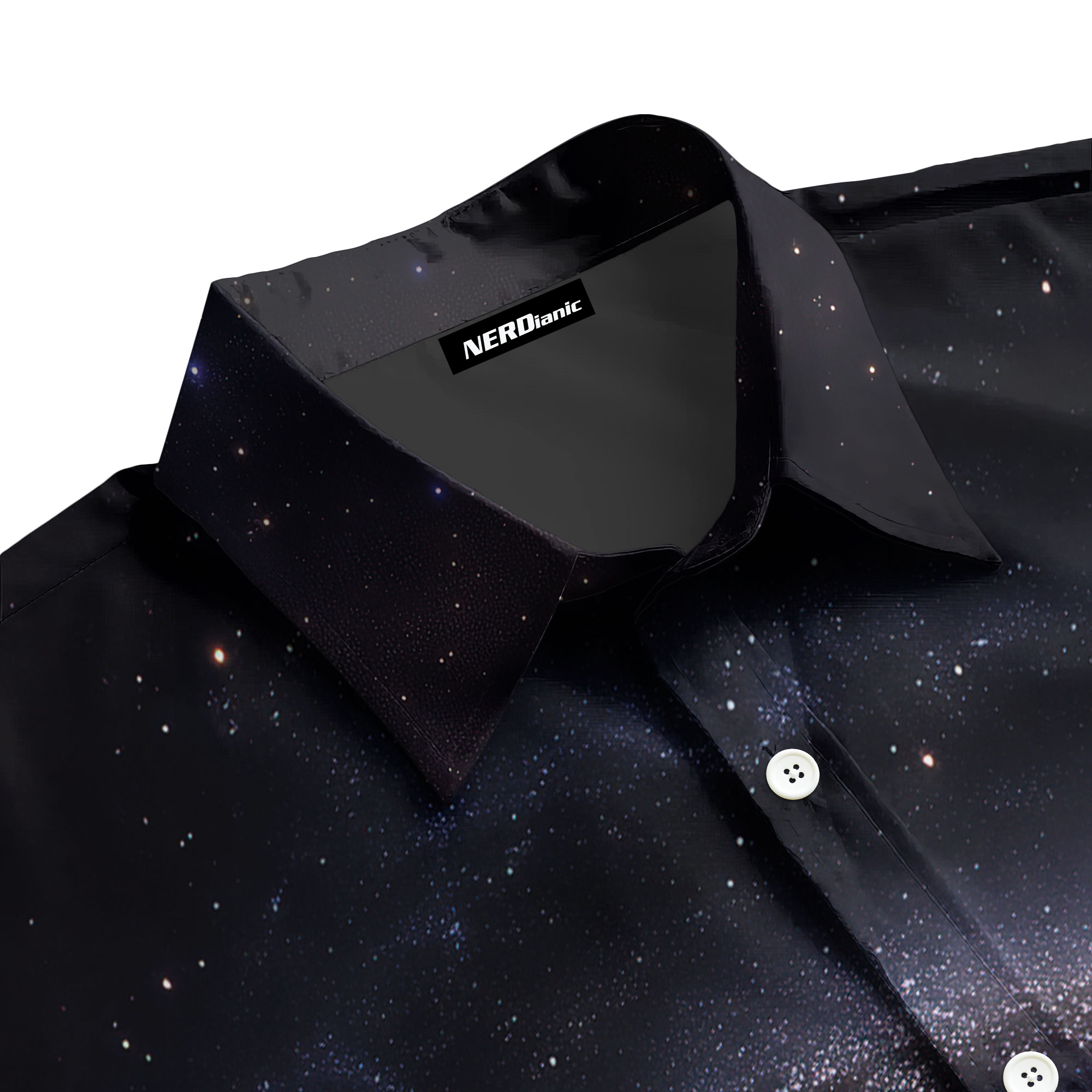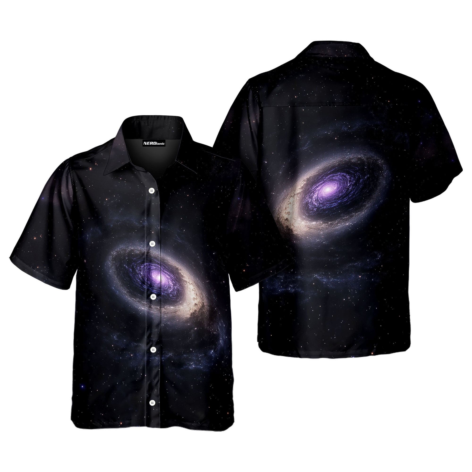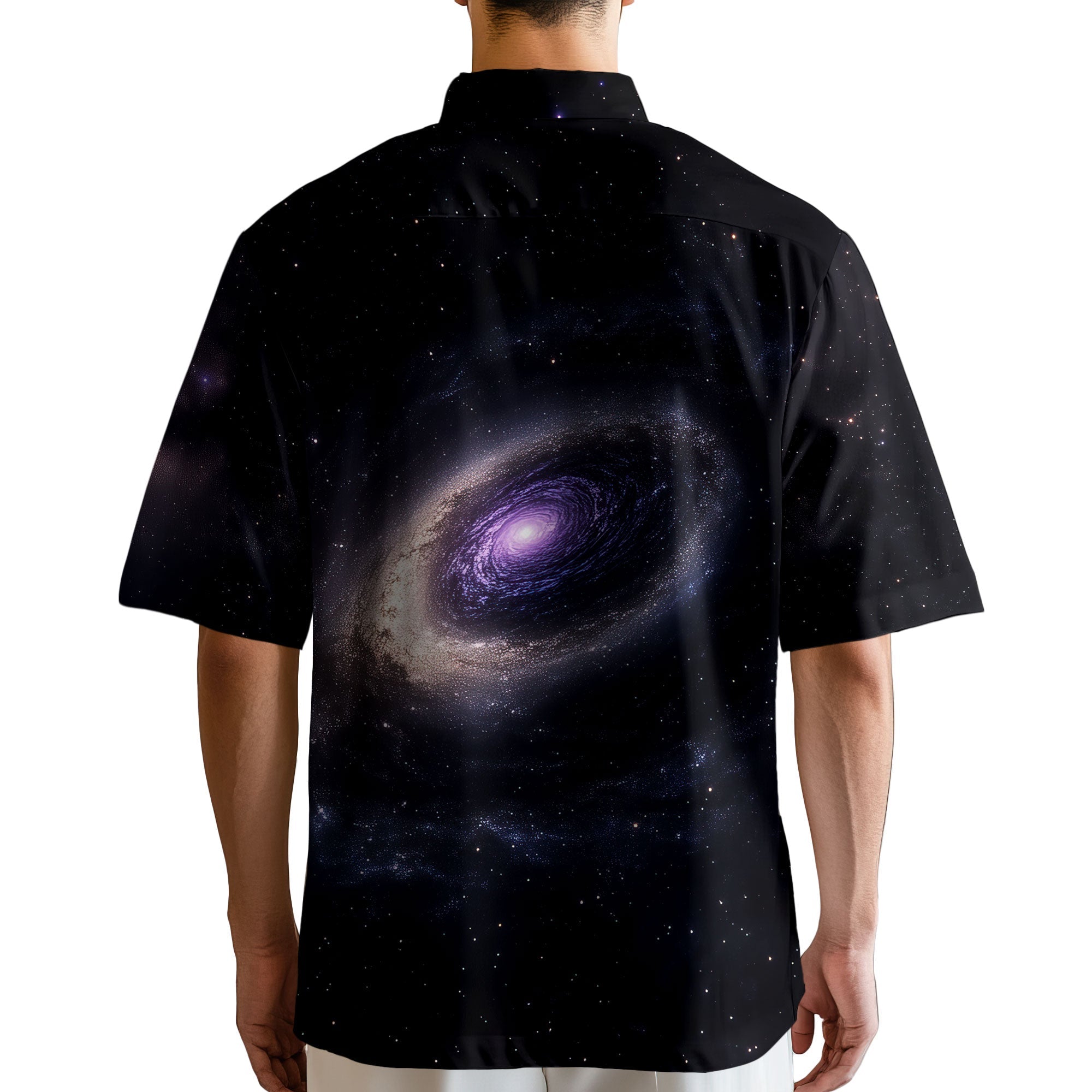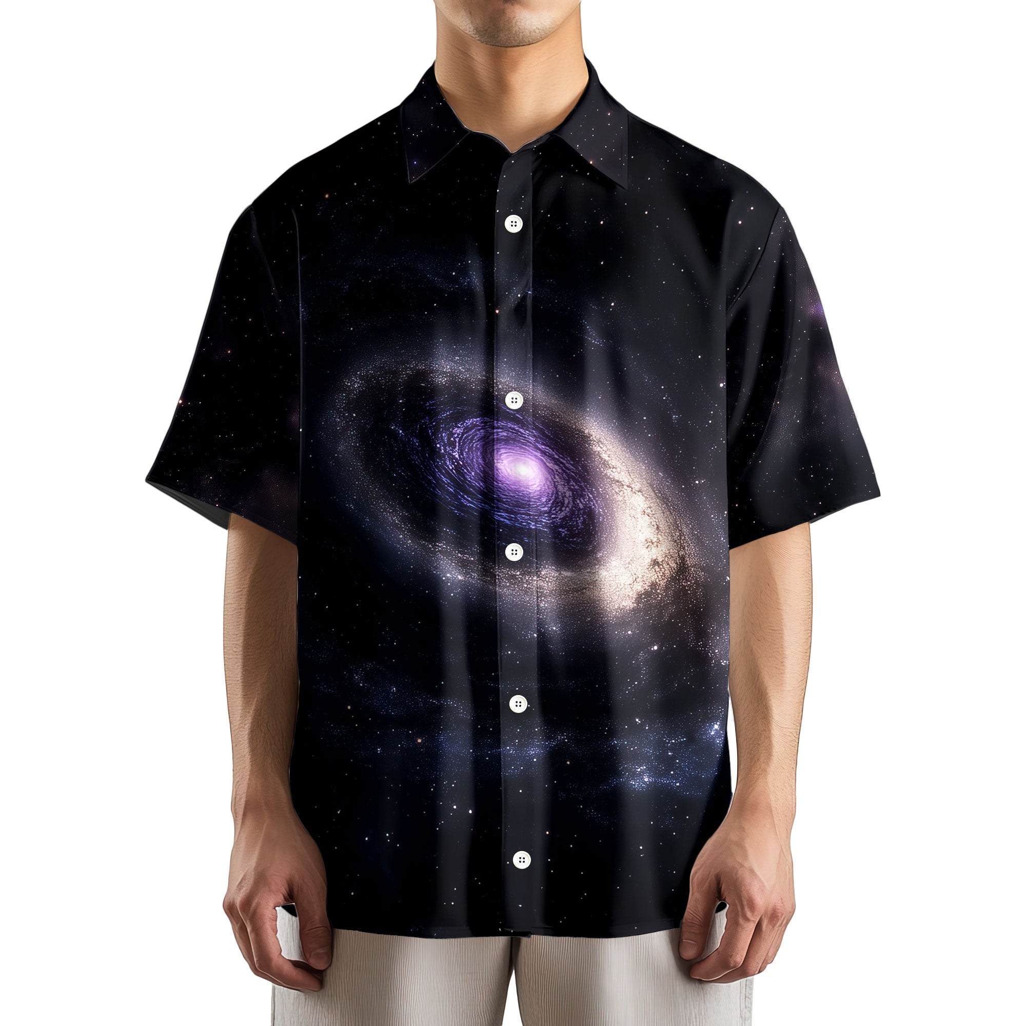 SPACE BUTTON SHIRT: This short-sleeve button-down shirt features a mesmerizing digital galaxy print, capturing the breathtaking beauty of deep space. The vividly detailed spiral galaxy, blending cosmic purples, blues, and blacks to create a visually stunning effect. Perfect for astronomy lovers, science enthusiasts, and stargazers