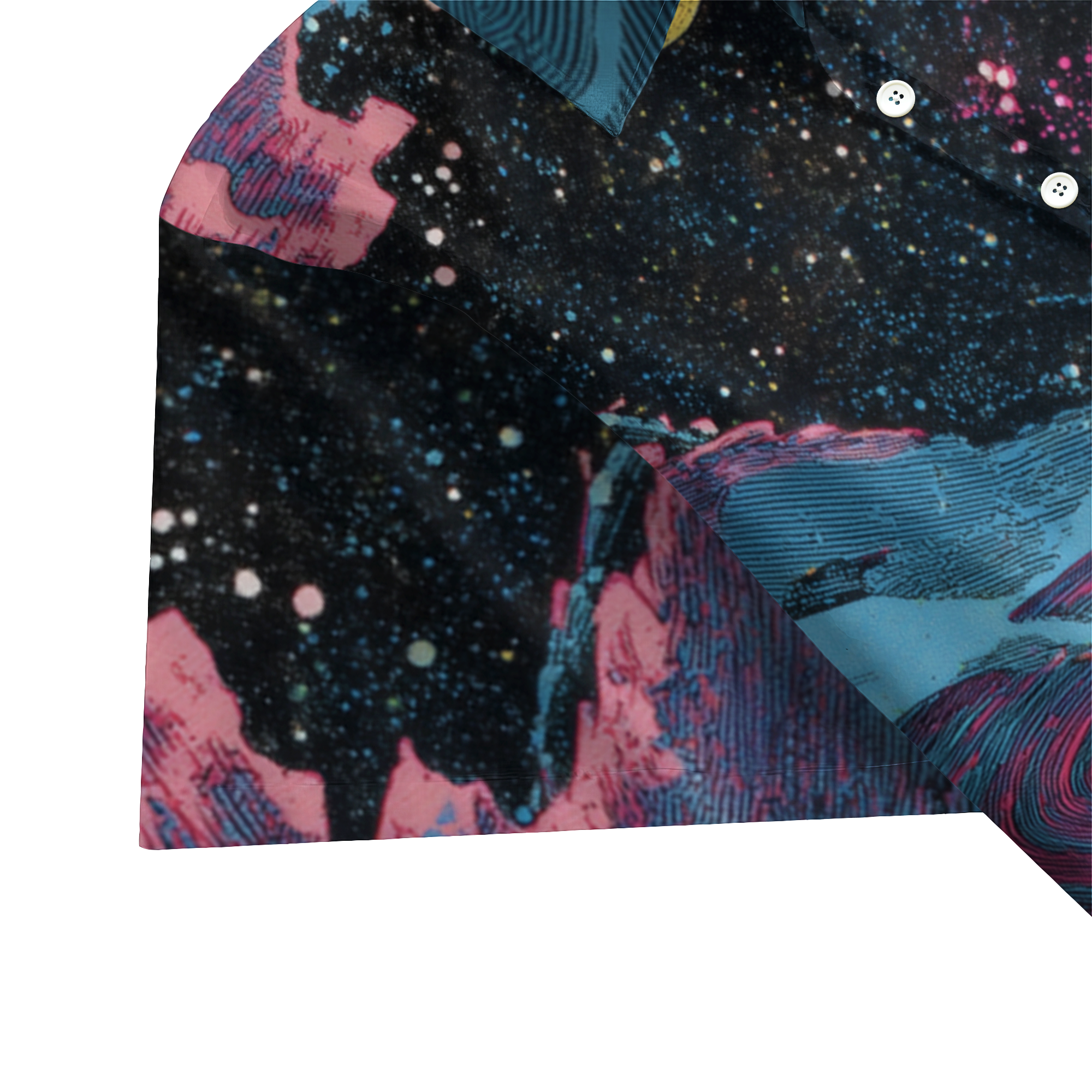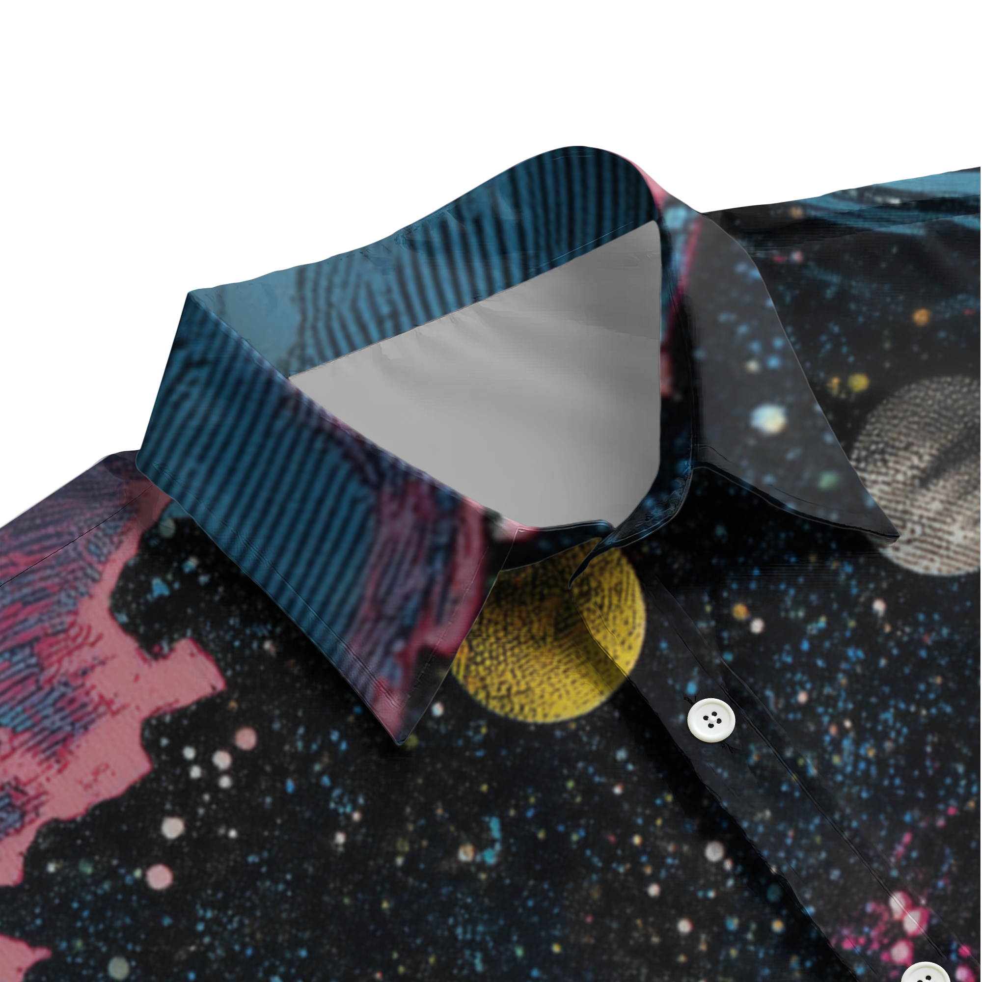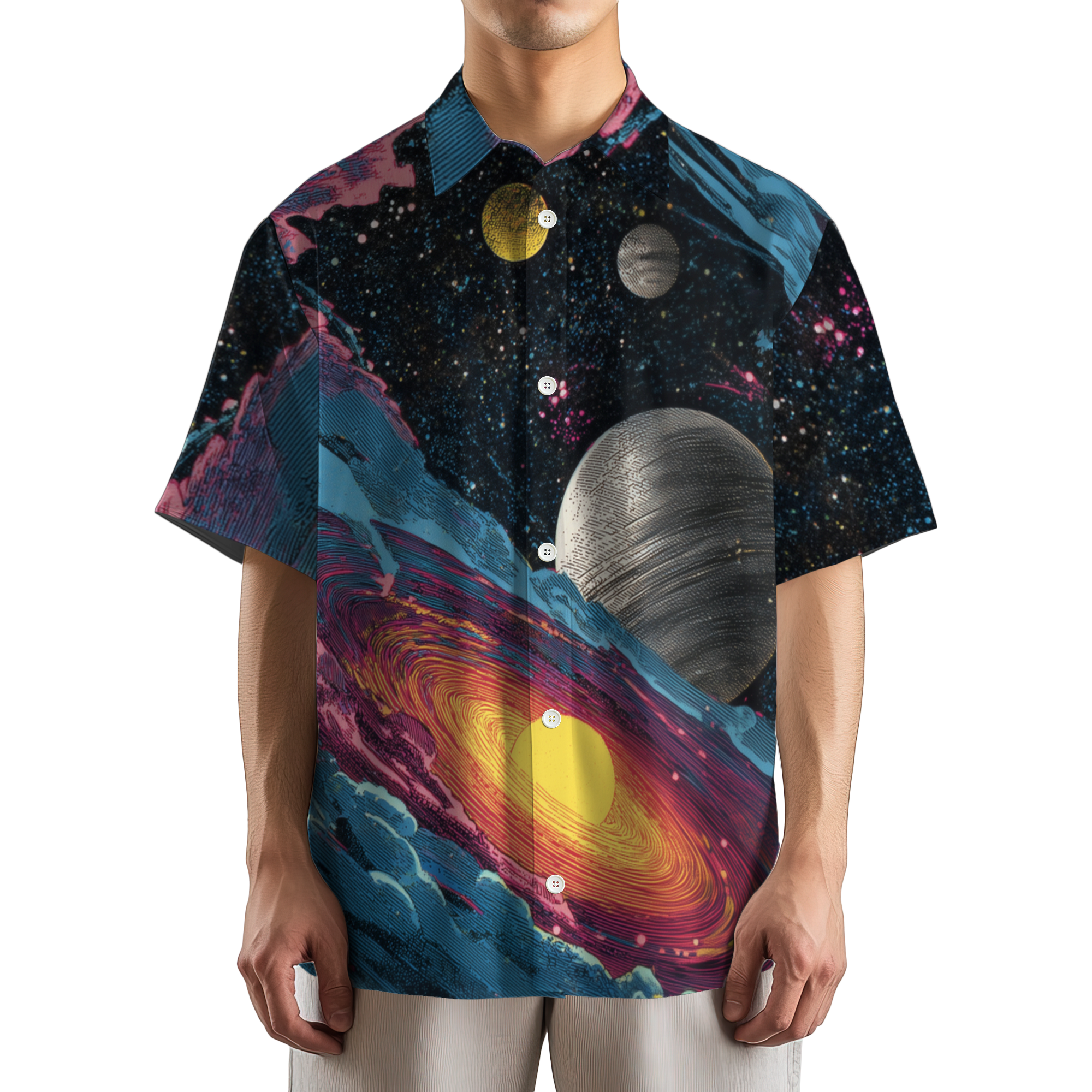 SPACE BUTTON SHIRT: This short-sleeve button-down shirt features a mesmerizing digital galaxy print, capturing the breathtaking beauty of deep space. The vividly detailed spiral galaxy, blending cosmic purples, blues, and blacks to create a visually stunning effect. Perfect for astronomy lovers, science enthusiasts, and stargazers