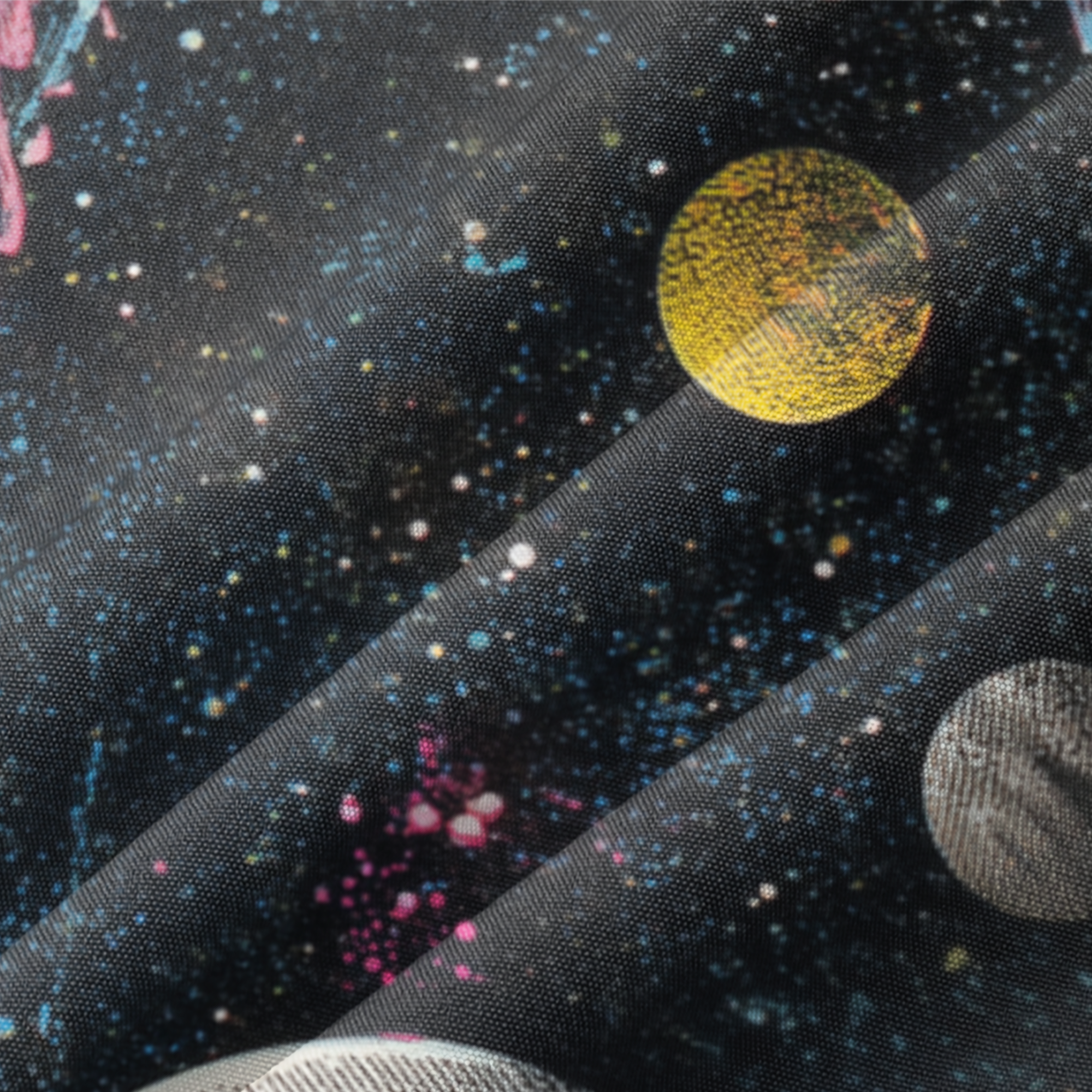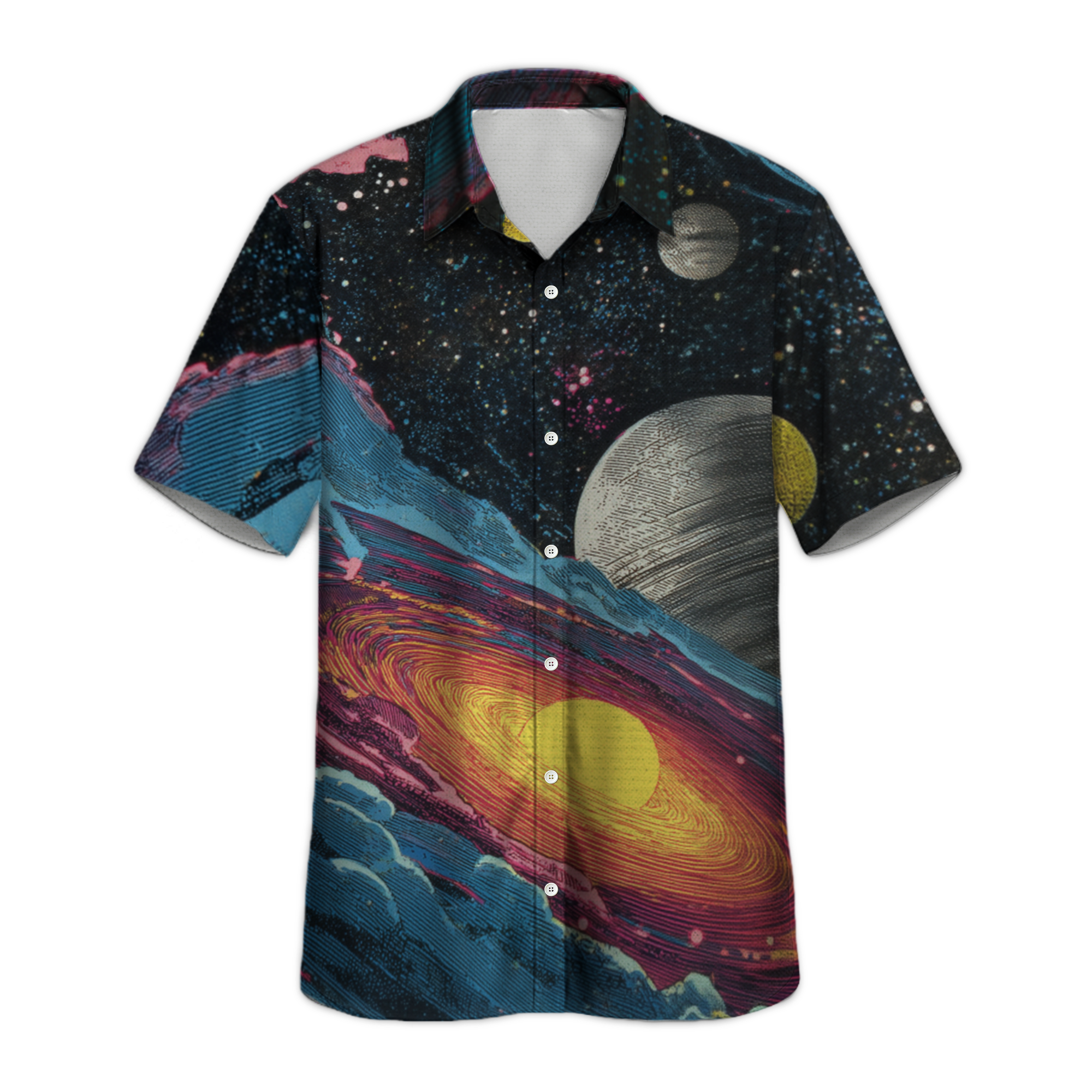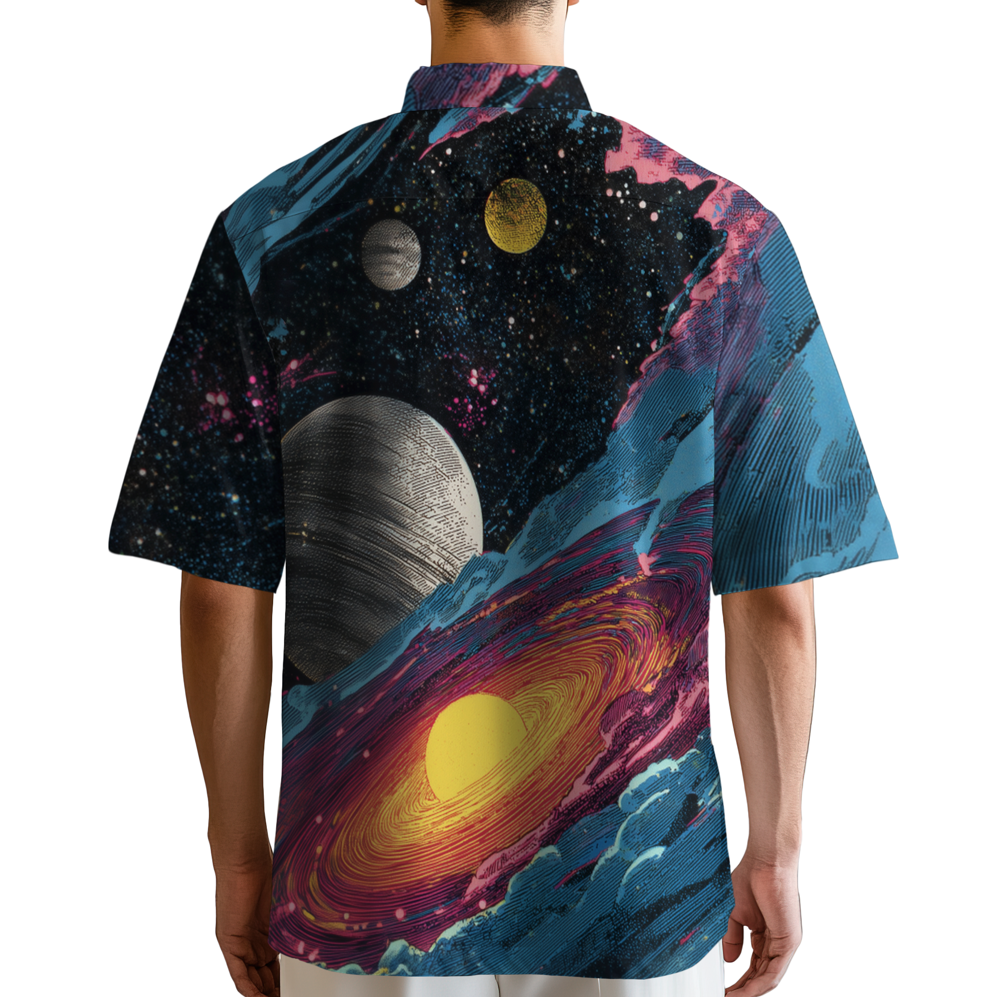 SPACE BUTTON SHIRT: This short-sleeve button-down shirt features a mesmerizing digital galaxy print, capturing the breathtaking beauty of deep space. The vividly detailed spiral galaxy, blending cosmic purples, blues, and blacks to create a visually stunning effect. Perfect for astronomy lovers, science enthusiasts, and stargazers